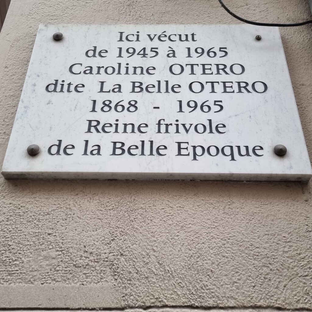 Suomeksi: Täällä asui 1945–1965 Caroline Otero eli La Belle Otero 1868-1965, Belle Epoquen kevytmielinen kuningatar.