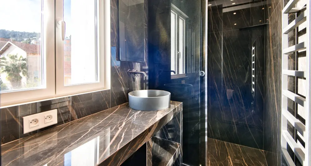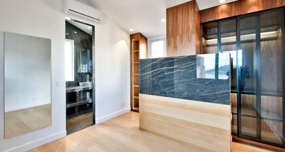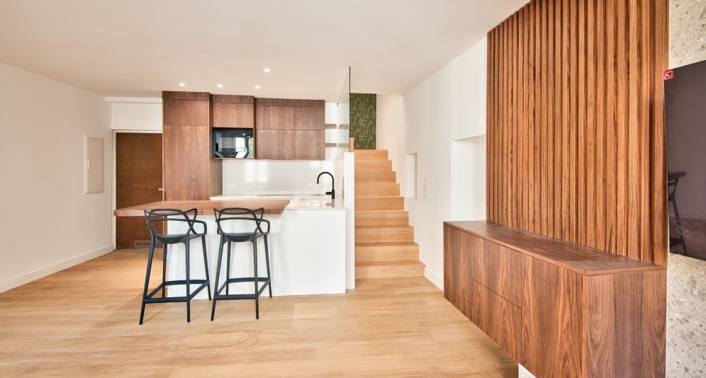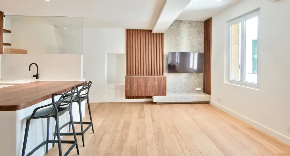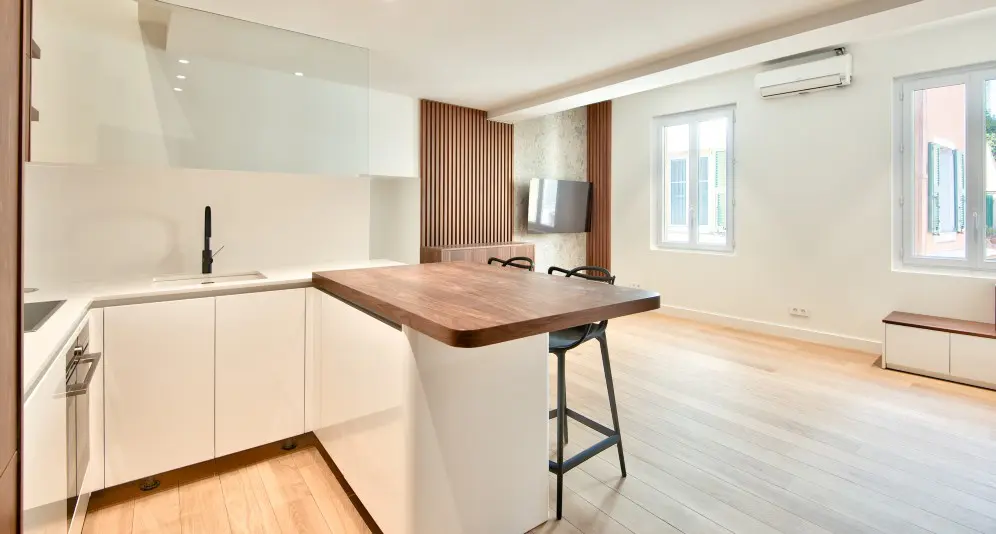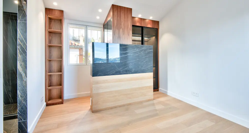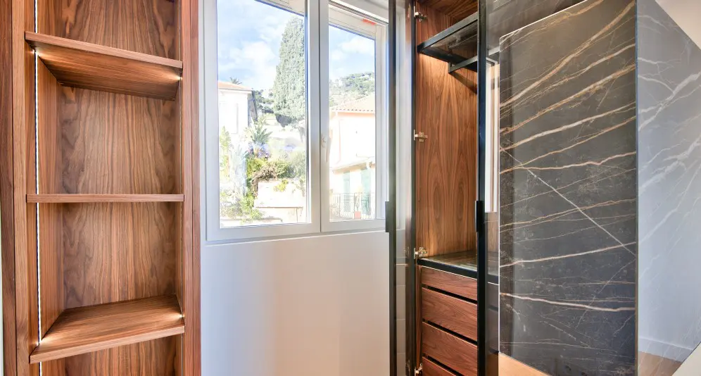 Asunnon alakerrassa on olohuone avokeittiöllä. Yläkerrassa on makuuhuone, kylpyhuone, wc ja vaatehuone. Yläkerrasta on postikorttimaisemat merelle ja Saint-Jean-Cap-Ferrat’lle.