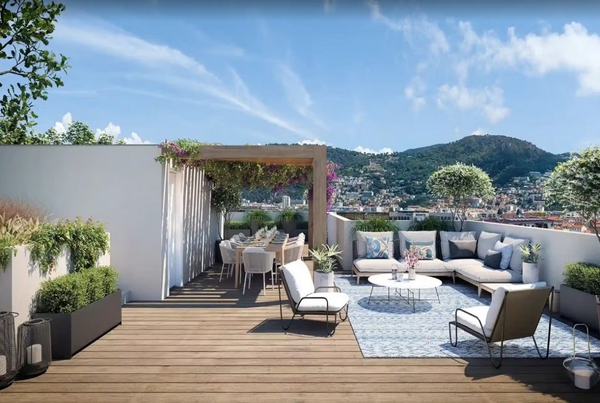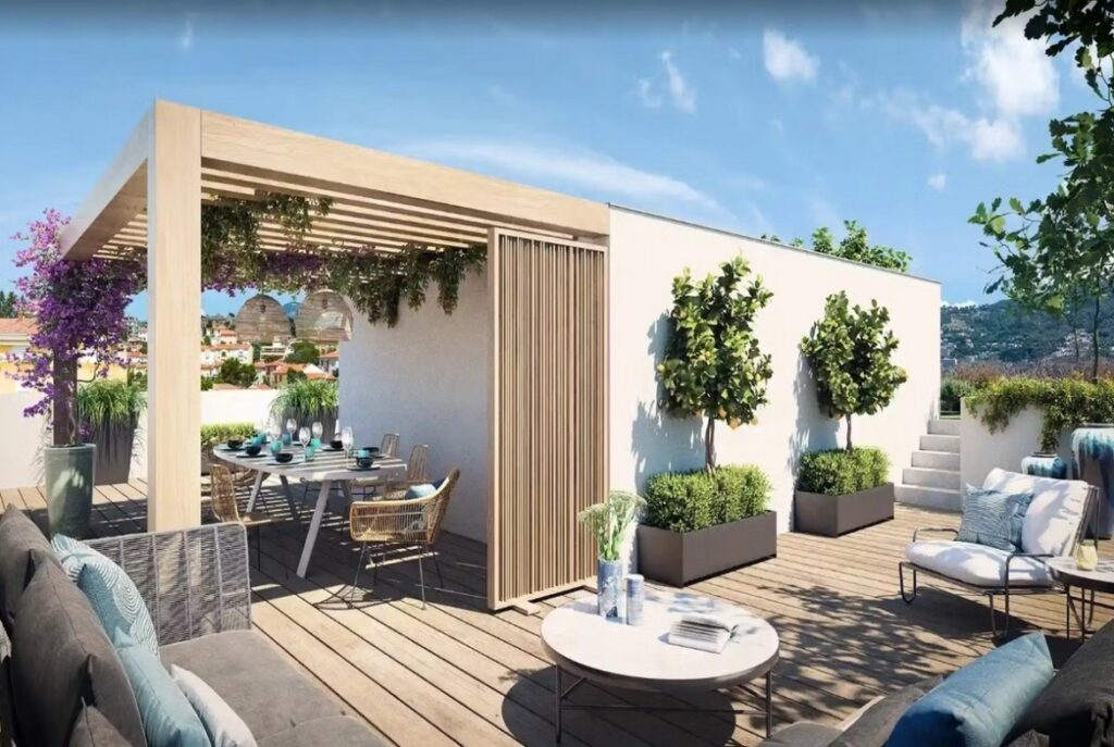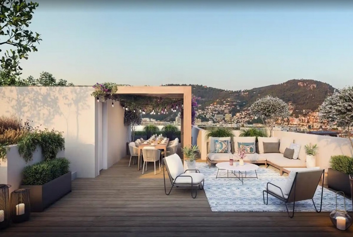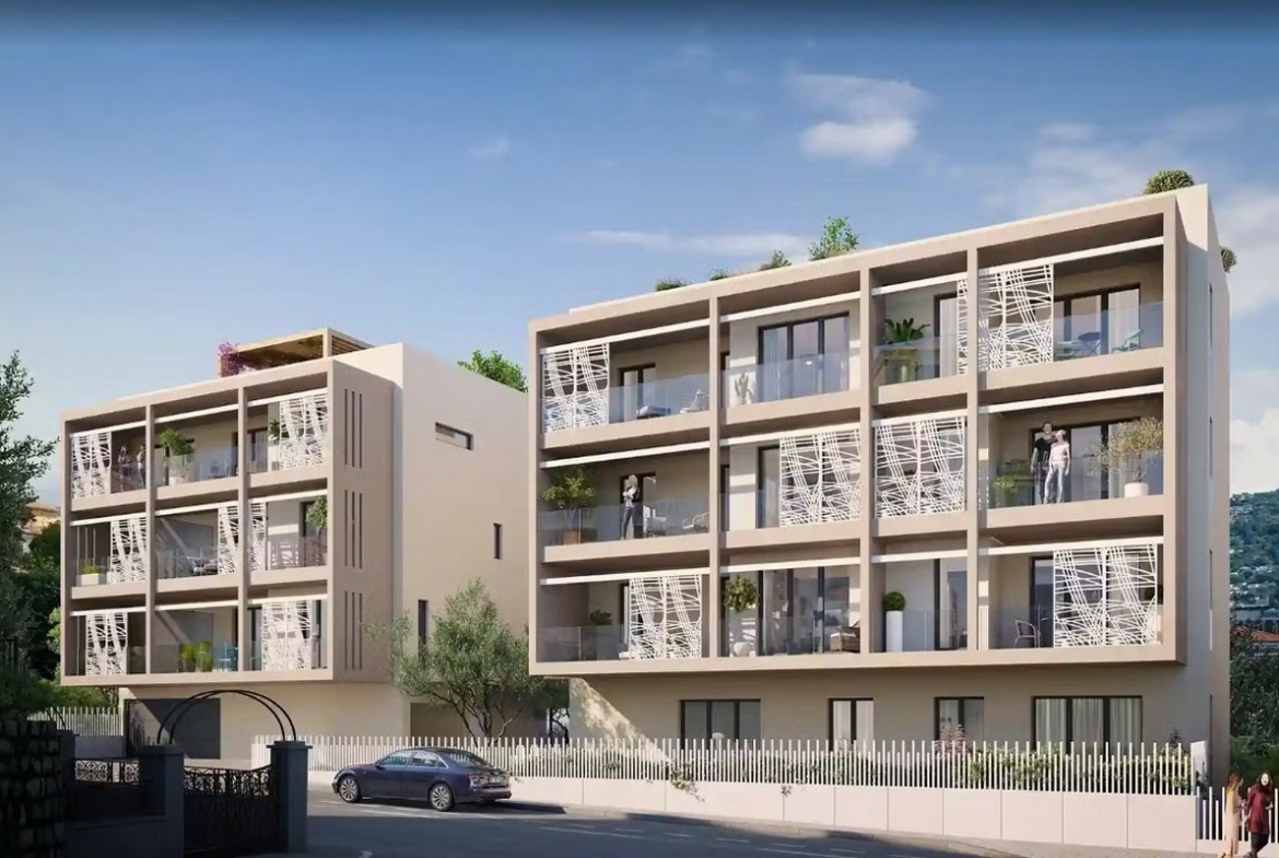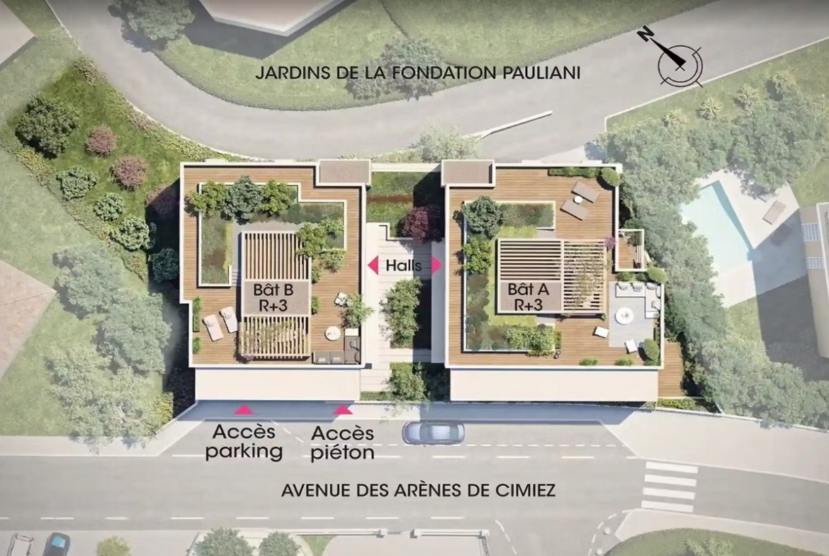 Avenue des Arènes de Cimiez’n taloyhtiö muodostuu 22 asunnosta ja kahdesta rakennuksesta, joiden välissä ja ympärillä on biodiversiteettiä vahvistavaa viheraluetta ja vanhoja oliivipuita. Rinnetontin vuoksi asuntoja on viidessä kerroksessa ja alimmissa kerroksissa on autohallit, joissa avopaikkoja, autotalleja ja kellarivarastoja. Kaikilla asunnoilla on viihtyisät parvekkeet tai terassit ja ylimmän kerroksen asunnoilla valtavat kattoterassit, joilla pergolat ja mahdollisuus kesäkeittiöön. Monen asunnon ilmansuunta on lounas, joten aurinko tuo valoa ja lämpöä. Terasseilla on näkö- ja aurinkosuojina tyylikkäät liukuseinämät. Joistain asunnoista aukeaa avarat maisemat Mont-Boronin kukkulalle.