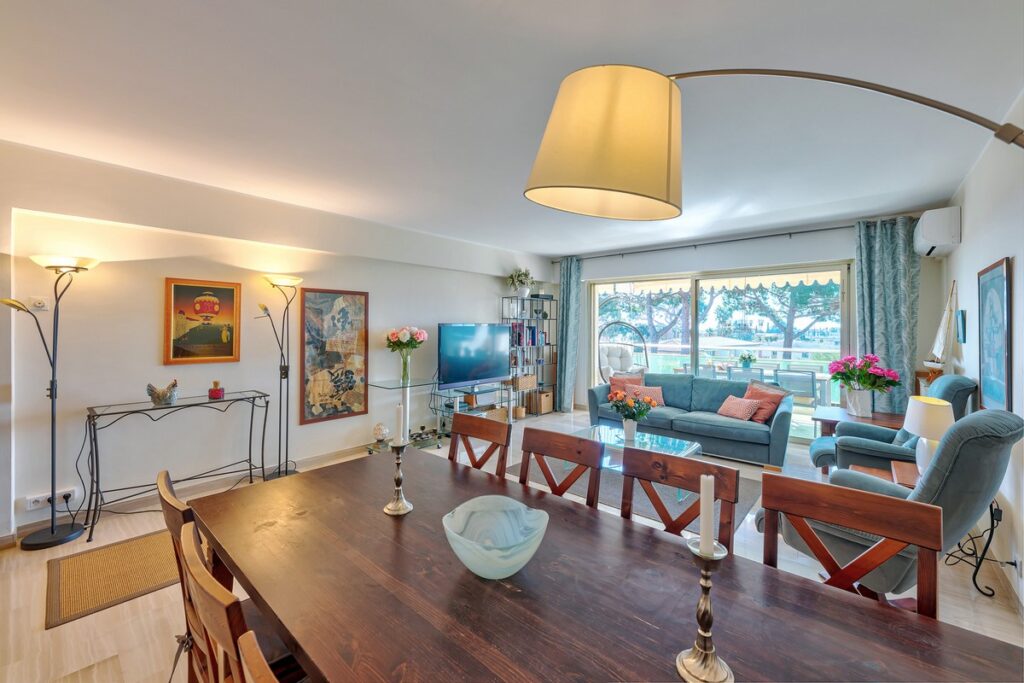 Asunnossa on eteinen, olohuone, erillinen keittiö, kaksi makuuhuonetta, kylpyhuone, jossa wc, toinen kylpyhuone sekä erillinen wc. Olohuoneesta ja toisesta makuuhuoneesta on käynti etelään suuntautuvalle 14 m2:n terassille, jolta aukeaa kauniit näkymät yhtiön puutarhaan ja merelle.