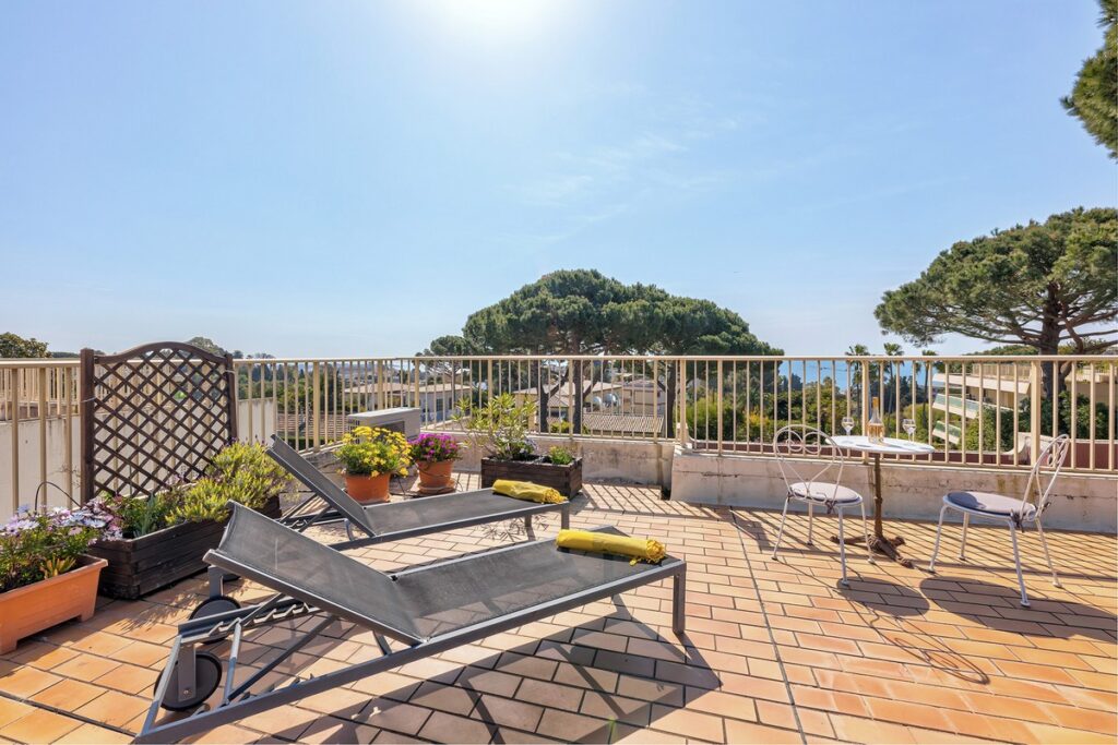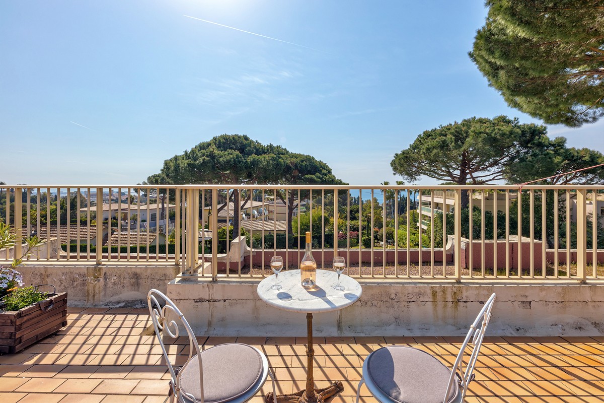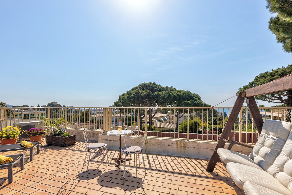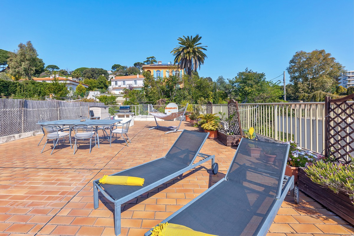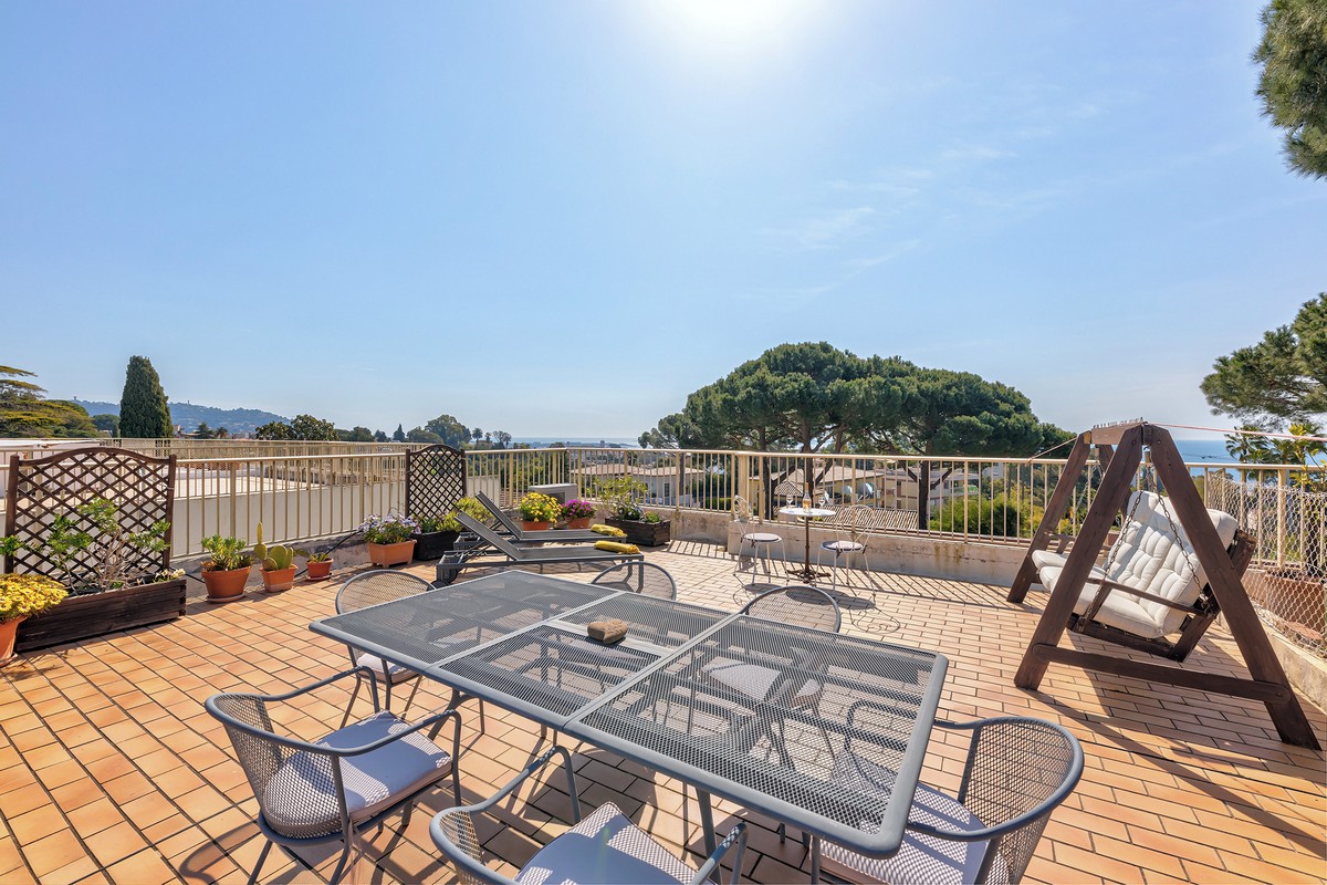 Myytävänä kolmio Cannesin suositulla Croix-des-Gardesin asuinkukkulalla, kävelymatkan päässä rannasta ja keskustasta. Asunto sijaitsee hyvin hoidetun taloyhtiön ylimmässä kerroksessa ja siinä on terassi sekä lisäksi iso kattoterassi merinäkymin.