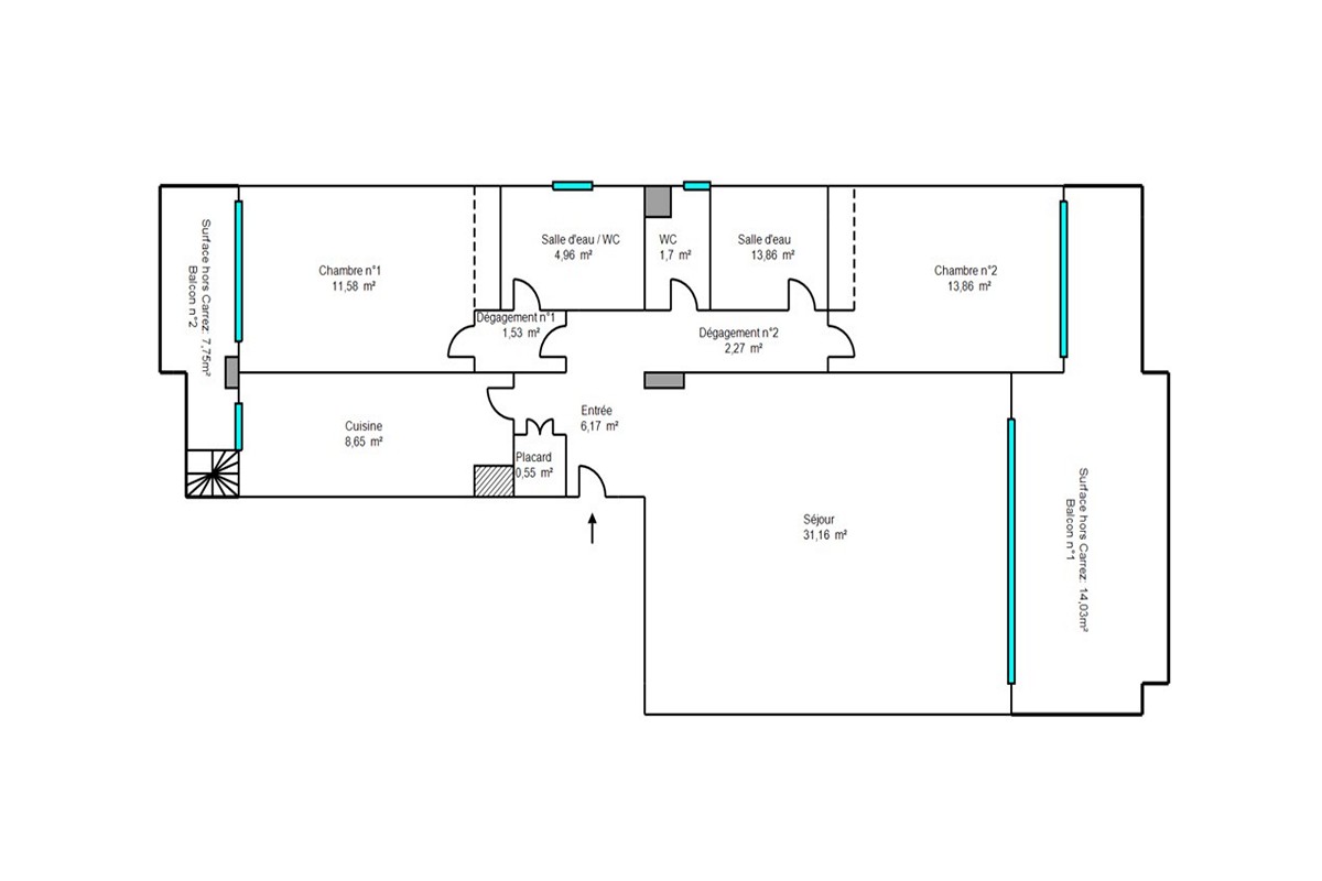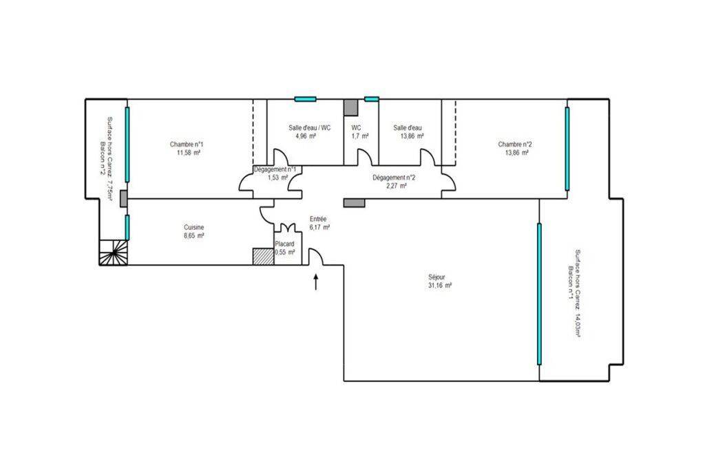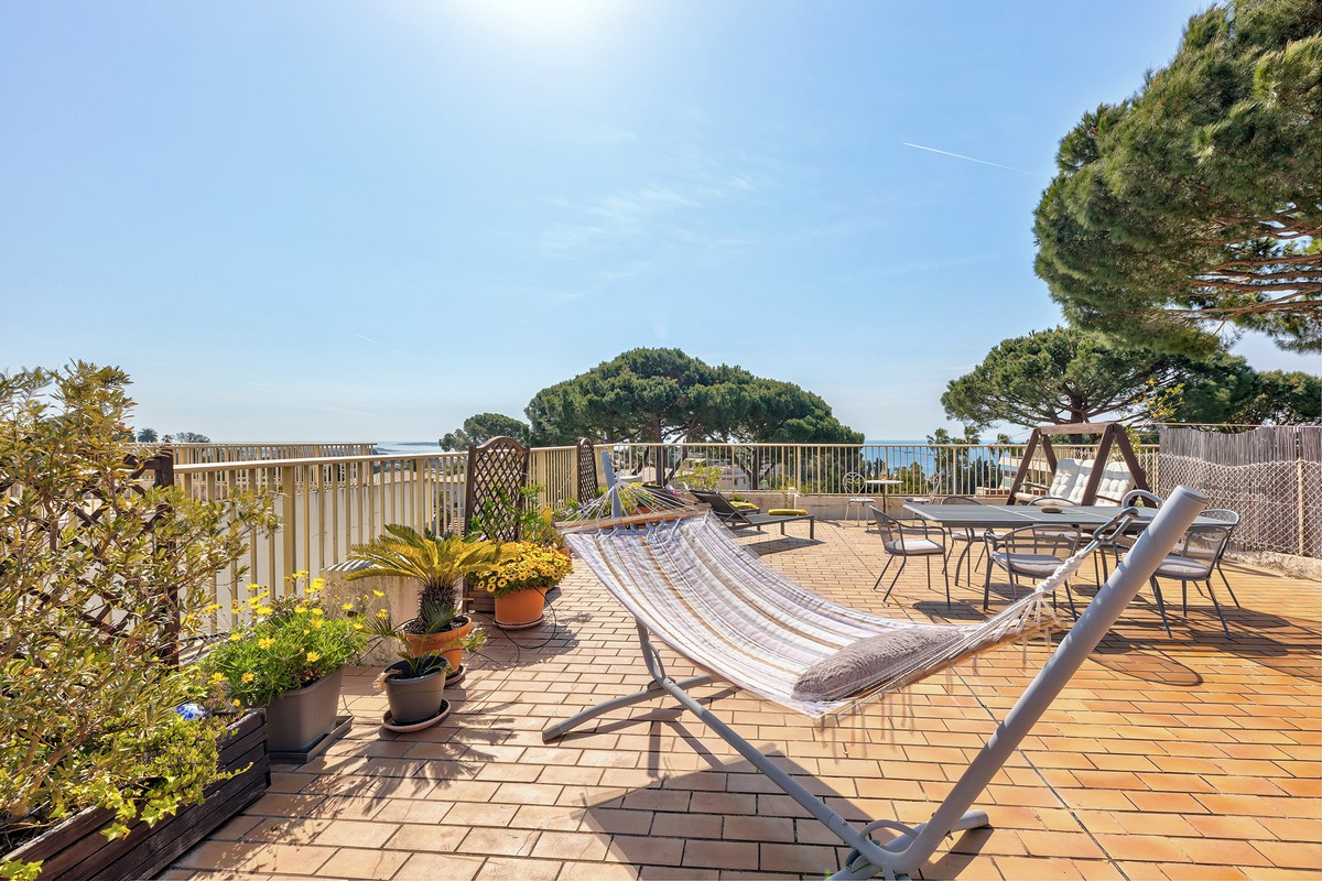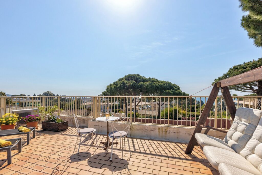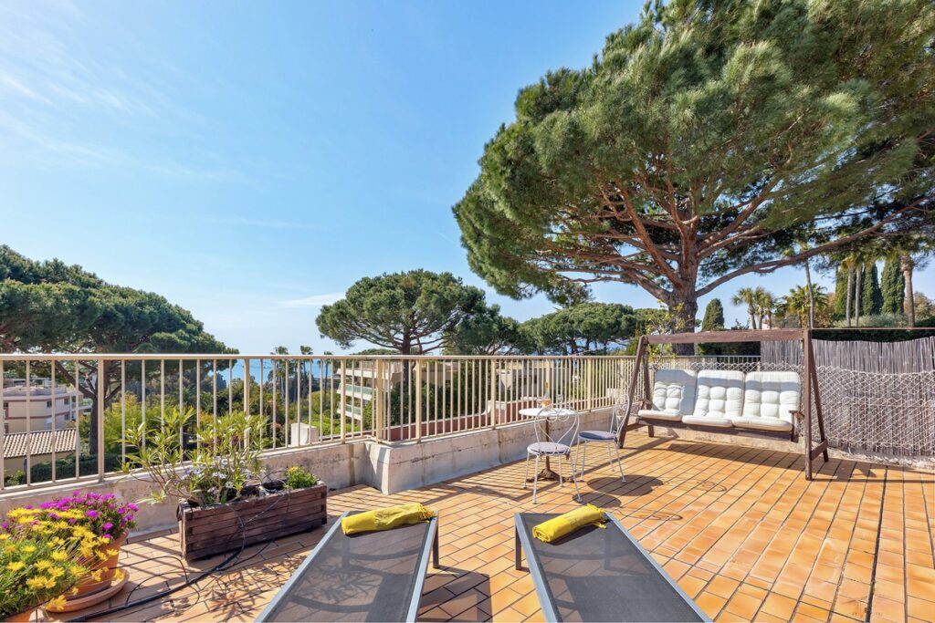 Myytävänä kolmio Cannesin suositulla Croix-des-Gardesin asuinkukkulalla, kävelymatkan päässä rannasta ja keskustasta. Asunto sijaitsee hyvin hoidetun taloyhtiön ylimmässä kerroksessa ja siinä on terassi sekä lisäksi iso kattoterassi merinäkymin.