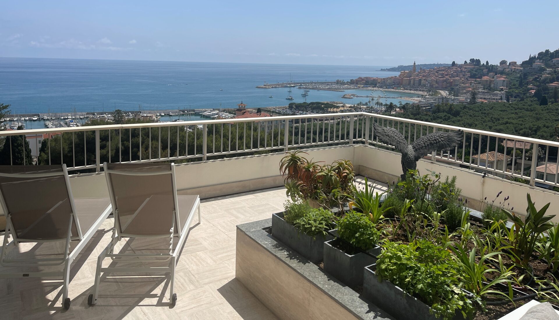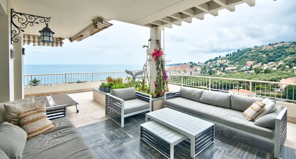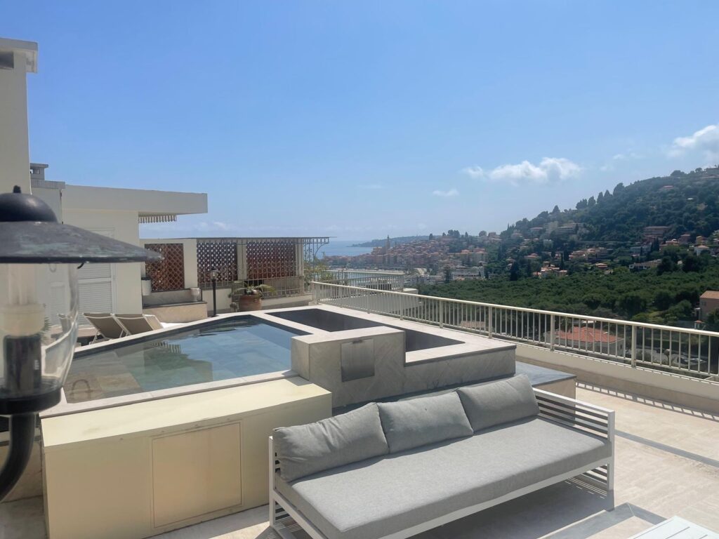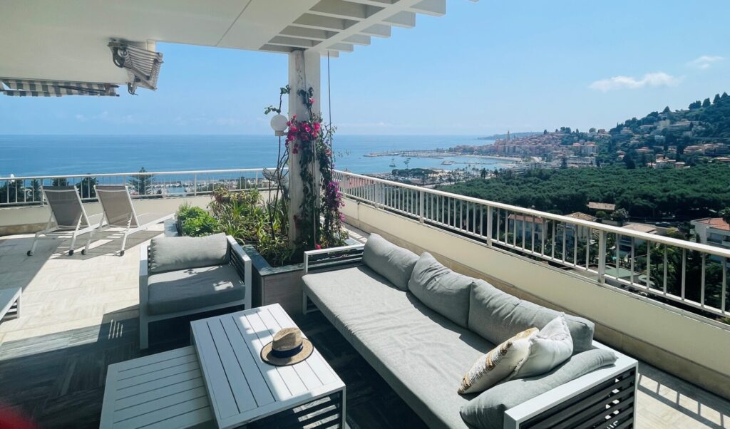 Myytävänä ylimmän kerroksen hulppea kattohuoneisto Mentonissa, arvostetun Garavanin rinteellä. Huoneisto sijaitsee erittäin korkeatasoisen taloyhtiön ylimmässä kerroksessa ja sen 365 m2 terassilta avautuu poikkeuksellisen kaunis maisema merelle ja Mentonin vanhaan kaupunkiin.