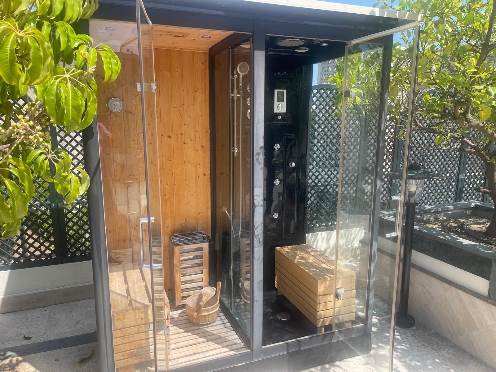Terassilta on kulku upealle, 235 m2:n kattoterassille, jossa on sauna, jacuzzi, paviljonki ja paljon oleskelutilaa – ja tietysti hurmaavat panoraamanäkymät merelle.