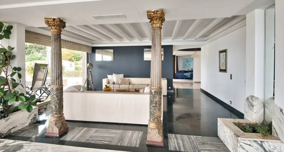 Asunnossa on ruhtinaallinen eteishalli, avara olohuone usealla oleskelutilalla ja avokeittiöllä, neljä tilavaa makuuhuonetta omilla kylpyhuoneillaan, joissa wc:t, kodinhoitohuone sekä erillinen wc. Kaikista huoneista on käynti parvekkeelle tai 130 m2:m pääterassille, jonka pääilmansuunta on lounas ja jolta voi ihailla postikorttimaisemia.