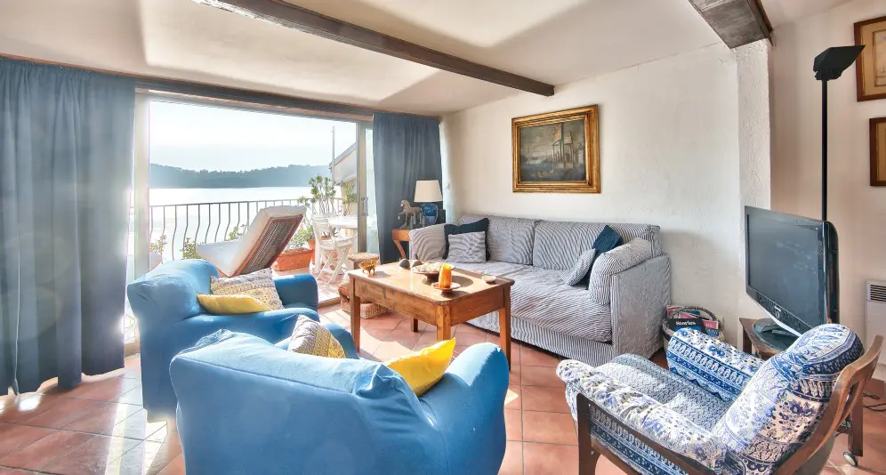 Asunnossa on olohuone, avokeittiö, kaksi makuuhuonetta, kolmas makuuhuone, joka sopii ennemmin työ- tai vierashuoneeksi sekä kylpyhuone wc:llä. Olohuoneesta on käynti 8,5 m2:n terassille, jolta näkymä Saint-Jean-Cap-Ferrat’n lahdelle.