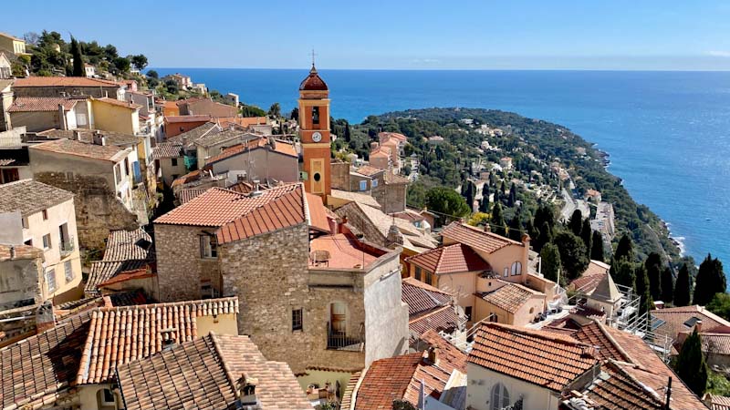 Klo 10.30 tasokas ilmastoitu pikkubussi hakee meidät Le Méridien -hotellin edestä, ja ajamme Moyen Cornichen huikeissa maisemissa Roquebrune-Cap-Martinin keskiaikaiseen kylään, joka on ollut Chanelille rakasta seutua. Chanel pyysi rakastettuaan, Westminsterin herttuaa, etsimään hänelle rauhallisen paikan meren ja taivaan väliltä, ja kylän pääaukiolta avautuu upea panoraamanäkymä ympäröivään maisemaan.